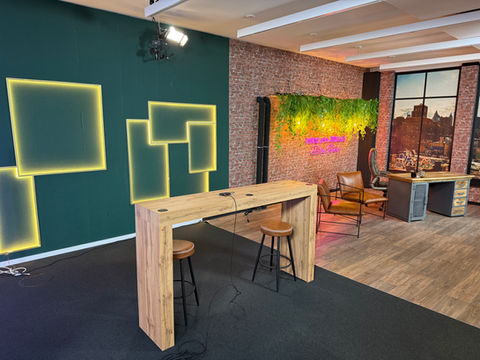 Unser Studio in München bietet Ihnen 4 vielseitig nutzbare Sets, ideal für die Produktion von Image-, Recruiting-, Event- und Lernvideos. Jedes Set ist individuell gestaltet und kann flexibel für Ihre Bedürfnisse angepasst werden. Zudem steht Ihnen ein großzügiger Empfangsbereich zur Verfügung, der auch für remote Arbeiten während der Dreharbeiten genutzt werden kann. Fordern Sie jetzt unverbindlich ein Angebot an und planen Sie Ihre nächste Produktion oder Ihr erstes Live-Event mit uns!